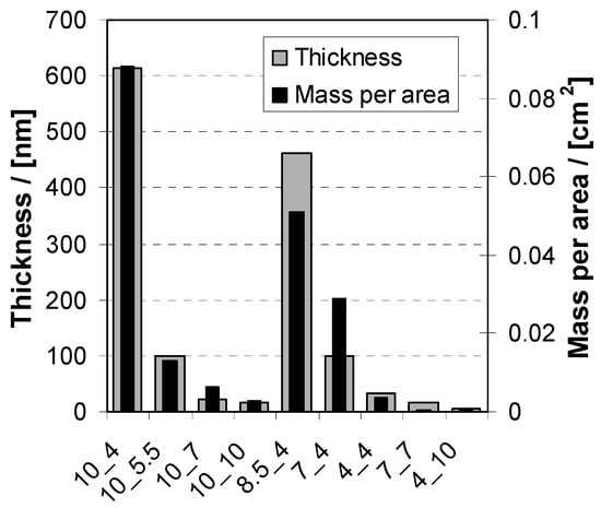 In Figure 2 values of the thickness (d) and mass per area (m/a) of PEM-10 coatings, which were deposited at a fixed cPEL = 0.005 M for various combined pH settings, are given. Qualitatively, the d and m values were in accordance and drastic changes were observed. Significantly, for the combination of pH = 10/4 the highest thickness of d = 620 ± 50 nm and highest mass per area m/a 0.088 ± 0.008 mg/cm2 of PEM-10 were obtained, while the lowest m/a < 0.001 mg/cm2 was obtained for the reverse combination of pH = 4/10 (no thickness determination possible due to incomplete PEM films). For the combinations of pH = X/4 and of 10/X, intermediate values between these two extrema were obtained.