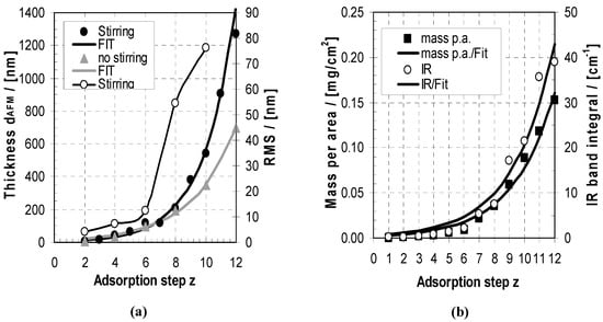 Convenient fits resulted (Figure 3a,b) when using parameters d0 = 6.15 + 0.75 nm and ad = 0.465 + 0.015, m0 = 0.00201 + 0.00051 mg/cm2 and am = 0.365 + 0.023, A0 = 0.529 + 0.210 cm−1 and aA = 0.366 + 0.035 cm−1 (full black curves, stirring), from which exponential increases can be observed. The higher exponential factor ad (thickness) compared to am and aA is presumably due to a decrease of PEM density with increasing z, which is also commented on below. The observation of exponential growth for the PEI/PAA system is in accordance with other PEM systems like PLL/HYA found by Schaaf and Voegel [24,25,26,27]. They convincingly claimed that internal diffusion of polyelectrolytes into and out of a highly porous PEM volume phase is the main factor of such so-called exponential systems, which can be obtained by CSLM using fluorescently labelled PEL. Additionally, we speculate that the increase of roughness and thus surface area with any adsorption step, as well as dynamic adsorption/desorption processes, contribute to the unambiguous uptake magnification of such PEMs. This will be addressed in the morphology part below. Related to these contributions, in Figure 3, slight modulation features in relation to z can be observed, so that for every PEI step we have a relative increase and for any PAA step there is a relative decrease in thickness. This gives a first hint that, upon the addition of one PEL not only adsorption to but also desorption from the actual PEMs might occur. Interestingly, stirring of the PEI, PAA and rinsing solutions during consecutive dipping process resulted in higher PEM deposition than without stirring, as shown in Figure 3 (stirring: black symbols and curve, no stirring: red symbols and curve). This is surprising at first glance, since stirring (i.e., applying shear) was expected to remove loosely bound PELs more effectively and thus result in lower deposition but also more stable PEMs. This point will be addressed in more detail in Section 3 and Section 4.
