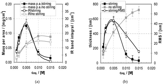 (a) Mass per area (left y-axis, full symbols) and integrated band area (1750–1425 cm−1) obtained by transmission IR (right y-axis, open symbols) of PEM-10 in relation to cPEL obtained by the dipping method and no drying after each rinsing step with (grey) and without stirring (black). (b) Thickness (left y-axis) of PEM-10 in relation to cPEL obtained by the dipping method and no drying after each rinsing step with (black cubes) and without stirring (grey cubes). Roughness values (RMS, right y-axis) of PEM-10 are included for the stirring case (open circles).