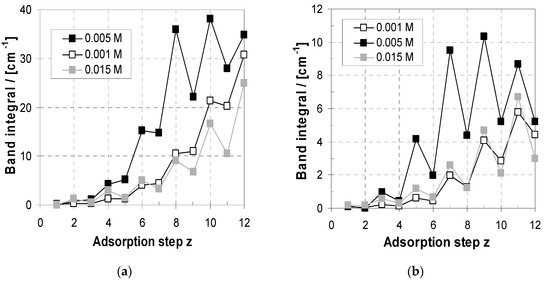 Furthermore, the uptake/loss modulation features seen in Figure 7b were studied in relation to cPEL. In Figure 8a the courses of APEI and in Figure 8b those of APAA are shown in relation to the adsorption step for cPEL = 0.001, 0.005 and 0.015 M, related to the individual adsorption steps. Generally, for a quantitative analysis of these ATR-FTIR data, it has to be checked if the PEM films can be treated as “thin,” which is the case for d < 200 nm [47,48]. In that case the band integrals can be assumed to be linearly related to the thickness. From Figure 5b it can be observed that this is the case for PEM-10 and 0.001 M (d = 200 nm) and 0.015 M (d = 25 nm), but for 0.005 M this is only the case until PEM-8. Hence, for 0.001 and 0.015 M variations within PEM-1-10 but for 0.005 M only within PEM-1‒8 can be directly compared.