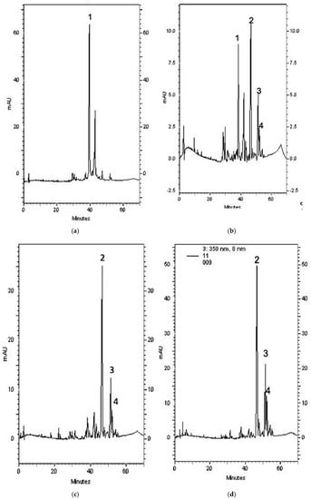 Chromatographs of (a) water extract, (b) ethanol extract, (c) acetone extract, and (d) ethyl acetate extract. Peak (1) represents baicalin, (2) represents baicalein, (3) represents wogonin, and (4) represents oroxylin A.