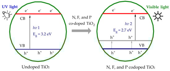 TiO2 is readily available, inexpensive, and chemically stable; however, there are two major drawbacks to TiO2 photocatalysis [,]. Firstly, the photo-excitation of unmodified TiO2 requires UV light. Secondly, the quantum yield for photochemical production of ROS is low due to the rapid recombination of electron/hole pairs [,]. The solar spectrum is predominately in the visible region, with only ~5% of the total irradiation in the UV region. A major challenge in TiO2 photocatalysis is to utilize the visible region of the solar spectrum. Extension of the TiO2 light absorption profile into the visible light region offers significantly improved economic viability compared to those requiring UV activation. A number of techniques including nonmetal doping with nitrogen (N), sulfur (S), carbon (C), fluorine (F), iodine (I), or boron (B), nonmetal codoping, metal deposition, dye sensitization, semiconductor coupling, and enriching the oxygen content of TiO2 have led to a variety of visible light activated (VLA) TiO2 materials over the last decade [,,,,,,,,,]. A number of metal doping materials has been previously explored; however, metal doping often produces undesirable metal titanates at high processing temperatures [,,,]. Nonmetal doping or codoping into the TiO2 modifies the valence band level of TiO2, reducing the effective band gap energy, as shown in Figure 1, and modulating the light absorption into the visible light region [,,,,,]. Although the incorporation of dopant elements can result in the advantage of narrowing band gap energies, dopants can influence charge carrier recombination processes, and the limited solubility of dopants into the bulk materials as well as thermal instability have limited photocatalytic applications of doped TiO2 materials [,,,,].