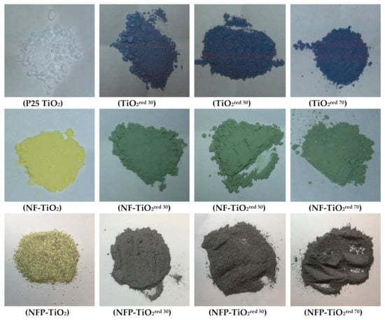 The colors of the prepared TiO2, presented in Figure 2, indicate visible light absorption. The UV-visible diffuse reflectance spectra of the reduced TiO2 samples, provided in Supplementary Materials (Figure S3), were used to determine the specific absorption edges and band gap energies. The results demonstrated the band gap energies of doped samples shift to the visible light region compared to the unmodified P25 TiO2. A reduction of the band gap energy from 3.1 eV to 2.23 eV was observed for P25 TiO2 after treatment for approximately one hour. For NF-TiO2 particles, the band gap energy dropped by 0.8 eV to 1.30 eV. The NFP-TiO2 particles possess a band gap of 2.7 eV, decreasing to 2.35 eV upon reduction. The insertion of N atoms into TiO2 lattices is reported to create a new interband state above the valence band of TiO2 leading to the observed absorbance shift into the visible light region []. Since the absorbance edges of the prepared samples shifted into the visible light region, we assigned surface modification and production of an amorphous layer on the TiO2 particle results to changes in the band gap energy and visible light absorption properties. The band gap energies calculated by Kubelka–Munk plots are summarized in Table 2.