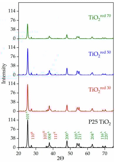 The performance of a photocatalyst is often dependent on the many factors, including the crystal structure, surface area, and composition [,,]. TiO2 can exist as three different forms; anatase, rutile, and brookite [,,,,]. Anatase is considered the most photocatalytically active crystal form. The photocatalytic activity of TiO2 can vary dramatically based on its lattice structure, and thus, X-ray powder diffraction (XRD) patterns were used to analyze the crystalline properties of synthesized TiO2 samples. The XRD data of P25 TiO2 and reduced TiO2 are provided in Figure 3. All observed peaks in the XRD patterns of the reference P25 TiO2 and the reduced TiO2red were indexed to anatase and rutile phases. The intensity of XRD peaks for TiO2red 70 associated with the anatase phase, however, decreased, indicating lower crystallization due to surface modification at longer treatment times without a significant change of crystallinity. Anatase (tetragonal structure, a and b) 3.78 Å; c) 9.50 Å) and rutile (tetragonal structure, a and b) 4.58 Å; c) 2.95 Å) are the two major forms of crystalline TiO2. Titanium oxide can also exist in another thermodynamically unstable form called brookite (rhombohedral structure, a) 5.43 Å; b) 9.16 Å; c) 5.13 Å). The brookite phase was not detected in any of the samples in this study. Previous experiments showed that anatase is kinetically more stable than rutile while rutile is reported to be more thermodynamically stable than anatase at normal atmospheric pressure and temperature [,]. It has been found that a crystalline mixture of the two different phases of titanium dioxide, such as anatase and rutile is more photoactive than 100% anatase [,,].