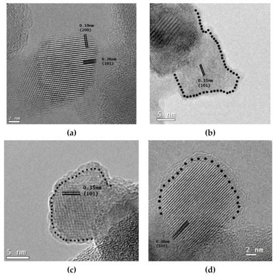 Micrographs of high-resolution transmission electron microscopy (HRTEM) of P25 TiO2 materials are presented in Figure 4, while the reduced forms of NF-TiO2, and NFP-TiO2 are included in the Supplementary Materials (Figure S1). The high crystalline order of the TiO2 nanoparticles with the characteristic lattice of anatase possessing indexed planes of (101) and (200) was observed in all samples. A thin amorphous layer was observed at the surface of the reduced TiO2 nanoparticles, indicative of surface modification. The measured thicknesses of the amorphous layers are tabulated in Table 1. The values of the amorphous layer and the characteristics of the crystalline order of the anatase suggest that we can modulate the amorphous layer by changing the duration of thermal treatment and consequently modulate the band gap energies into the visible light region.