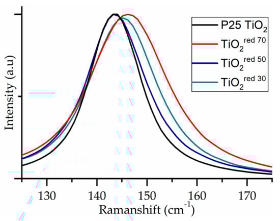 Raman spectra of the TiO2 materials exhibited the characteristic bands corresponding to Eg1, Bg1, Ag1, and Eg3 at 146, 396, 516, and 637 cm-1, respectively (data shown in Supplementary Materials Table S1), for the vibrational modes of the anatase phase of TiO2 []. Small shifts of the vibration mode were observed, as shown in Figure 5. The modest shift is assigned to the surface disorder as a result of the amorphous layer over the TiO2 nanoparticle (possible formation of oxygen vacancies or nonstoichiometry defects). Amorphous surface layers can also lead to peak broadening. Oxygen vacancy promotes the charge carrier separation and can potentially enhance the photocatalytic performance [].