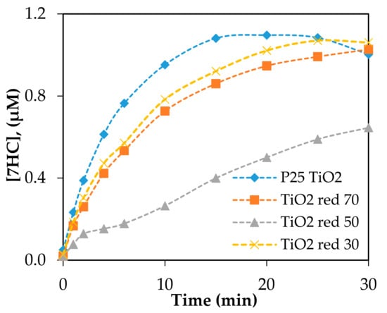 The production of 7HC by reduced P25 TiO2 photocatalysts irradiated at 350 nm. Catalyst loading was 0.10 g/L; [COU] = 125 µM.
