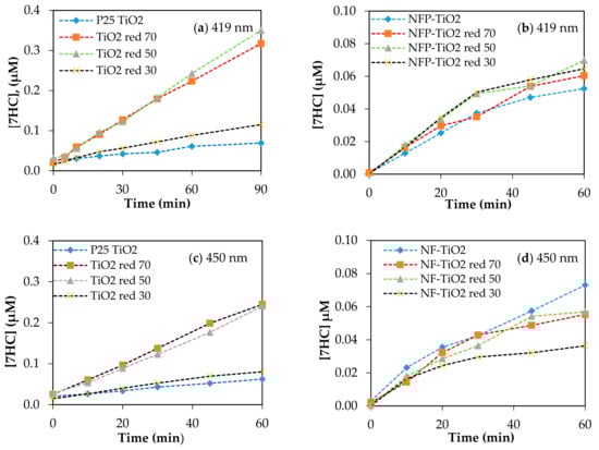 Production of 7HC using various TiO2 upon irradiation at visible light (a,b) 419 nm; (c,d) 450 nm. Catalyst loading was 0.10g/L; [COU] = 125 µM.