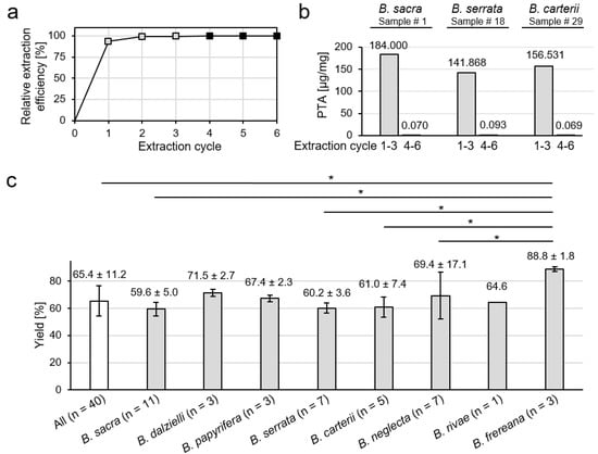 Methanolic extraction of Boswellia oleogum resins. (a) Average extraction efficacy obtained from sample # 1 (B. sacra), sample # 18 (B. serrata), and sample # 29 (B. carterii) with increasing extraction cycles. (b) Total amount of pentacyclic triterpenic acids (PTA) extracted from oleogum resins in µg/mg frankincense. Comparison of extraction efficacies of combined extraction cycles 1 –3 and 4–6. (c) Comparison of the extraction yields (w/w) of different Boswellia species. Data are mean ± SD. Groups were compared by Kruskal-Wallis one-way analysis of variance and the Mann-Whitney U test (* p < 0.05).