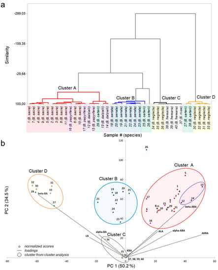 Multivariate statistical analysis of pentacyclic triterpenic acid (PTA) concentrations in Boswellia oleogum resins. Samples # 1–11 (B. sacra, red), samples # 12–14 (B. dalzielli, violet), samples # 15–17 (B. papyrifera, pink), samples # 18–24 (B. serrata, blue), samples # 25–29 (B. carterii, green), samples # 30–36 (B. neglecta, yellow), sample # 37 (B. rivae, grey), and samples # 38–40 (B. frereana, grey). For further sample information refer to Table 2. (a) Dendrogram of cluster analysis. The samples were assigned to four different clusters: cluster A (red), cluster B (blue), cluster C (grey), and cluster D (yellow). (b) Biplot of principal component analysis (PCA) with clusters from cluster analysis and subgroup (violet) for B. dalzielli. Sample B.o. (ʹXʹ B.o., B. occulta) was added subsequently.