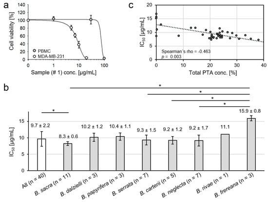 Still, total amounts of PTA correlate significantly to extract toxicity to cancer cells (Figure 5c). Analysis of the correlation between the IC50 values and concentrations of the individual substances revealed the highest positive correlation between cytotoxicity and the content of acetylated PTA without keto groups. Thus, the β-ABA exhibited the highest Spearman’s correlation between cytotoxicity and its content in oleogum resin (p = 0.0001), followed by ALA (p = 0.0004), α-ABA (p = 0.002), LA (p = 0.008), and β-BA (p = 0.022). Likewise, the extract obtained from sample # 26 (B. carterii) exhibited the highest content of β-ABA und ALA and high levels of α-ABA and showed the highest toxicity against the tested cancer cells with an IC50 = 7.28 µg/mL.