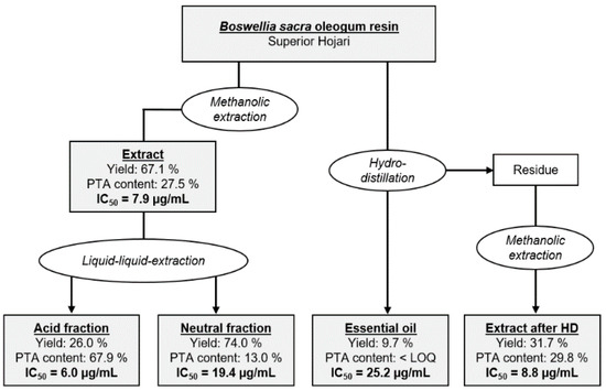 In addition to PTA, Boswellia oleogum resins contain further ingredients toxic to breast cancer cells. These might be neutral pentacyclic triterpenic substances like amyrin and lupeol, or mono- and bicyclic monoterpenes like limonene and α-pinene [14,18,37]. Particularly, B. frereana contains high amounts of 3-epi-lupeol [12], which could explain its toxicity against the MDA-MB-231 breast cancer cells in the absence of PTA. Also, other studies indicated that the activity of Boswellia oleogum resin extracts can be higher than that of purified individual boswellic acids [3]. Therefore, oleogum resin of the species B. sacra (sample # 1) was separated into different fractions (Figure 6 and Table S2). After extraction with methanol, the extract was separated by liquid-liquid-extraction yielding an acid fraction and a neutral fraction. In a different approach, the oleogum resin was hydrodistilled to obtain the essential oil. Afterwards, the residue was extracted with methanol yielding an extract after hydrodistillation. By enrichment of acidic components, the total PTA concentration increased from 27.5% to 67.9%. The enriched acid fraction exhibited a higher cytotoxicity with an IC50 of 6.0 µg/mL compared to the non-fractionated extract with an IC50 of 7.9 µg/mL (Student´s t-test: p = 0.012). The neutral fraction with decreased PTA concentration and the essential oil that was void of detectable PTA, both exhibited considerably lower cytotoxicity with an IC50 = 19.4 µg/mL and an IC50 = 25.2 µg/mL for the neutral fraction and the essential oil, respectively. Although the PTA contents of the extract after hydrodistillation could be increased by removal of the essential oil, it showed lower cytotoxicity with an IC50 of 8.8 µg/mL compared to the non-fractionated extract. It is possible that high temperatures during hydrodistillation degrade natural emulsifiers. As a result, solubility of the nonpolar PTA and thereby the availability for the cells could be decreased. In line with that, the bioavailability of boswellic acids in vivo depended critically on the presence of bile acids and was therefore significantly increased by a concomitant high-fat meal [38]. Likewise, bioavailability of boswellic acids in a formulation with lecithin, a natural emulsifier, was greatly enhanced [39]. The possible synergetic effects of acidic components and components of the essential oil could not be disregarded either.
