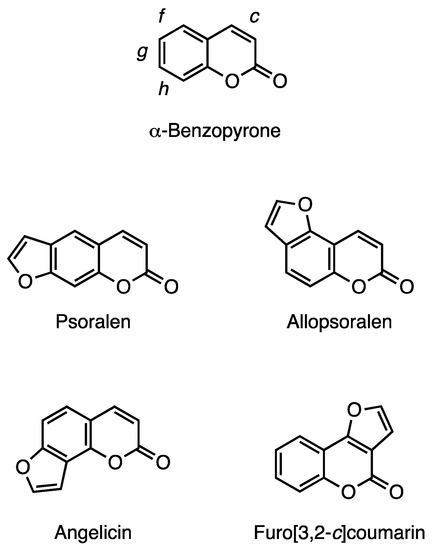 - Kitamura, N.; Kohtani, S.; Nakagaki, R. Molecular aspects of furocoumarin reactions: Photophysics, photochemistry, photobiology, and structural analysis. J. Photochem. Photobiol. C 2005, 6, 168–185. [Google Scholar] [CrossRef]