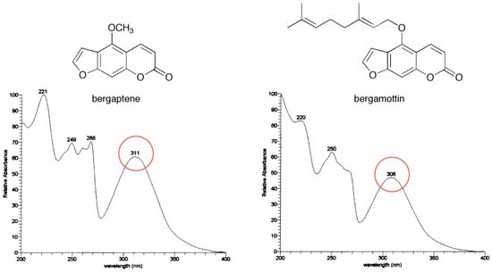 UV/Vis spectra of bergaptene (left) and bergamottin (right), two psoralens from Citrus bergamia Risso.