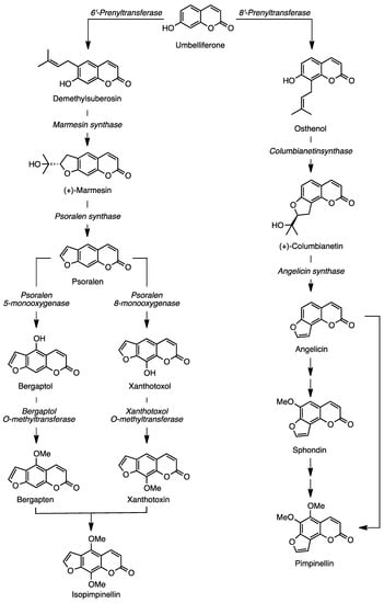 As for the angular derivatives, less is known than for the linear ones. Osthenol is converted by the enzyme, columbianetin synthase, into (+)-columbianetin, which is in turn transformed into angelicin by an angelicin synthase [8]. The enzymes for the synthesis of sphondin and pimpinellin have not been isolated to date.