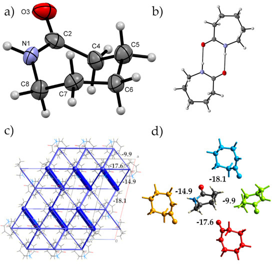 (a) Numbering scheme for ε-caprolactam highlighting the chair conformation that the molecule adopts in the crystal structure under ambient conditions (b) The amide dimer hydrogen-bonding interaction between two ε-caprolactam molecules that is observed in the crystal structure (c) The total interaction energy framework of ε-caprolactam as calculated by CrystalExplorer [25]. The thickness of the framework indicates the strength of interaction (dimer interaction: −68.2 kJ·mol−1). Other interaction energies between the dimers are indicated. (d) The top four non-hydrogen bonding interactions of the central molecule with nearest neighbours (values are in kJ·mol−1).