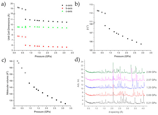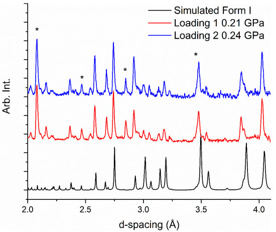 Beyond the transition point, further compression to 3.13 GPa showed no significant change in the observed diffraction pattern (Figure 4d). We do observe that Form III, which we observed using single-crystal diffraction, grows in to a small extent and contributes to the peaks at approximately 3.6 & 4 Å. This growth begins at 2.0 GPa but does not show any increase as the pressure was applied. The time for the diffraction data from 2–3.13 GPa to be collected was ~20 h so there was not a long time for the nucleation of Form III.