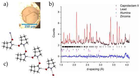 (a) A crystal of Form II of caprolactam grown from ethyl acetate from Form III crystals on decompression from 3.45 GPa to 0.55 GPa; (b) the Rietveld profile fit of Form II caprolactam-d10 to the neutron powder diffraction pattern collected at 0.943(11) GPa in 1:1 pentane:isopentane (crystals recrystallized from ethyl acetate); (c) the chain motif that is present in Form II of caprolactam.