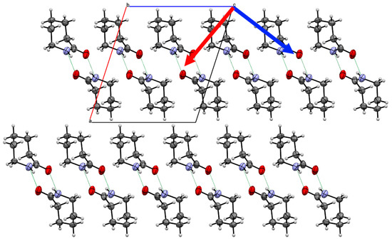 Crystal structure of Form II caprolactam viewed down the b-axis indicating two of the principal components of strain (Red arrow 19.1(2) TPa−1; Blue arrow 4.58(11) TPa−1). The third component is along the b-axis. The blue arrow indicates the direction of least compression. Whilst the molecules of one chain are positioned between the molecules of the neighbouring chain, the orientation of the molecules does not allow an increase in the degree of interlock.
