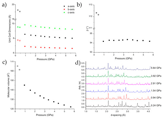 Compression of the unit cell dimensions (a,b,d) indicating the phase transition to Form III caprolactam. There is a discontinuity in the molecular volume over the transition (c). The error bars are smaller than the symbols.
