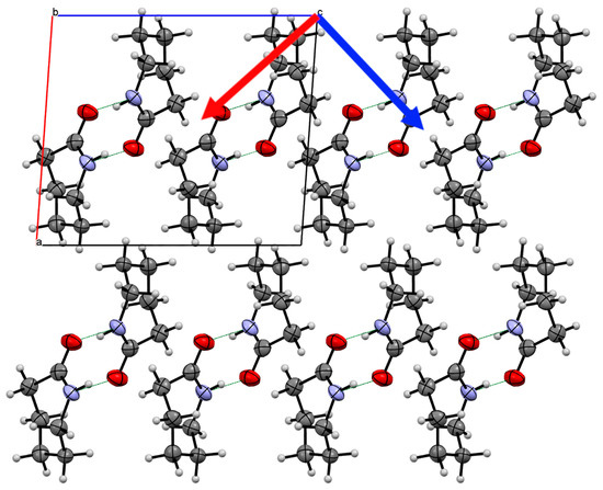 In terms of the changes to structure with respect to pressure, these are more easily explained by the principal axis of strain. The strain tensor provides three directions of greatest compression in the crystal structure; one of which is along the [0 1 0] direction due to the symmetry of this polymorphic form. We observe that two of these axes are equally compressible [0 1 0] and the approximate [−2 0 1] direction but the third is significantly more rigid (18.8(4), 19.1(2) and 4.58(11) TPa−1) [33]. Compression along the [−2 0 1] direction pushes the hydrogen-bonded chains together where the soft van der Waals interactions are relatively easy to compress (Figure 5). The molecules are hydrogen bonded along the [0 1 0] direction; hence, one might assume that this would be rather rigid, however this is not the case. The position of the molecules in the chain allow them to be compressed towards each other like a spring. The lack of any other hydrogen-bonding groups on the alkyl group allows the molecule to move easily; hence, the hydrogen-bonded chain is able to act like a spring. The least compressible direction is along the approximate [1 0 2] direction. This direction is perpendicular to the chains and forces the chains together. There is not enough space for the chains to interlock further due to the orientation of the molecules. In addition, the molecules, in the same chain, are already in close proximity to one another due to the hydrogen-bonding interaction; hence any further compression is restricted.