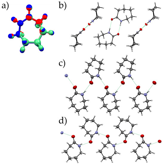 (a) An overlay of caprolactam molecules from three forms at 1.2 GPa created using Mercury [35] (Form I: Red, Form II: Blue, Form III: Green; RMS deviation between I and II 0.0310 and I and III 0.0131); hydrogen-bonding patterns for Form I (b), Form II (c), Form III (d). Form II and III showing the catemeric pattern with different orientations of molecules with respect to the direction of the chain.