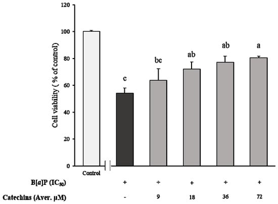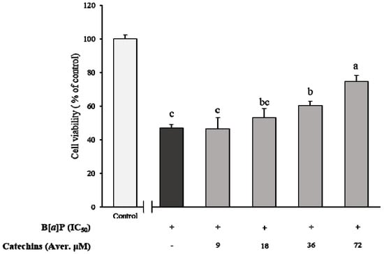 Determination of B[α]P treated HepG2 cell viability (% of control) after co-culture with different concentrations of catechins for 24 h. The values are mean ± SD in triplicate. Each bar with different letters is significantly different among treatments. a p < 0.001 as compared with control; b p < 0.001 as compared with control; c p < 0.001 as compared with control. Control indicates HepG2 cells treated by DMEM without B[α]P.