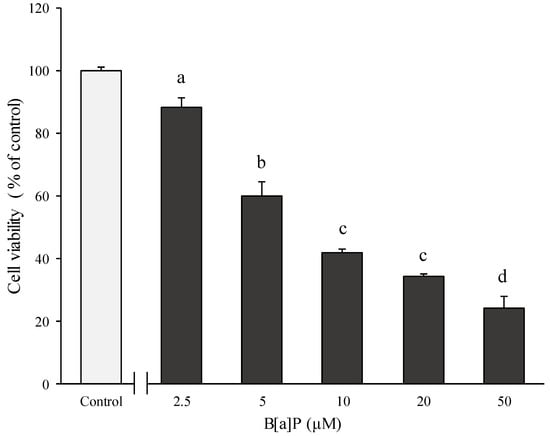 Effects of Benzo[a]pyrene (B[α]P) on cell viability (% of control). human liver hepatocellular carcinoma (HepG2) cells were treated with different concentrations of B[α]P for 24 hr. The values are mean ± SD in triplicate. Each bar with different letters is significantly different. a p < 0.01 as compared with control; b p < 0.001 as compared with control; c p < 0.001 as compared with control; d p < 0.001 as compared with control. Control indicates HepG2 treated by Dulbecco’s Modified Eagle Medium (DMEM) without B[α]P.