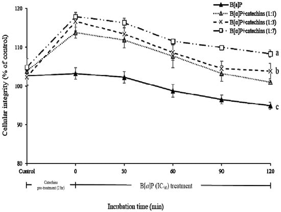 The current study evaluated the cellular integrity of HBMECs induced by the IC50 value of B[α]P after treatment with different ratios of catechins (B[α]P vs. catechins; 1:0, 1:1, 1:3, 1:7) by measuring the TEER values (Figure 5). When B[α]P was treated without catechins, the cellular integrity slightly and slowly declined according to the incubation time and reduced after 2 h of incubation, and it reached 94% at 120 min. When different ratios of catechins were pre-treated, the cellular integrity increased by approximately 9–14% compared with the initial incubation time. The cellular integrity steadily decreased as incubation time increased after treatment with the IC50 value of B[α]P. However, the final cellular integrity of HBMECs treated with catechins was a maximum 1.14 times higher than with the absence of the catechins pre-treatment.