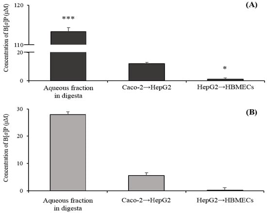 The transported concentration of B[α]P to HBMECs by the in vitro bio-mimic system (Upper GI tract→human intestinal epithelial cells (Caco-2)→HepG2→HBMECs). B[α]P only (A) and B[α]P with catechins (B). The values are mean ± SD in triplicate. The asterisk indicates a significant difference between groups. (* p < 0.05 and *** p < 0.001).
