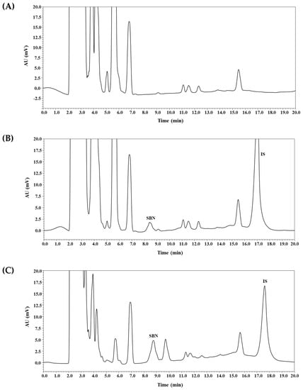 A Shimadzu HPLC-UV system with a pump (LC-20AT), an autosampler (SIL-20AC), a column oven (CTO-20A), and an ultraviolet detector (SPD-20A) was used in this study (Shimadzu Co., Kyoto, Japan). A Kinetex C18 column (250 × 4.6 mm, 5 μm, 100 Å; Phenomenex, Torrance, CA, USA) protected by a C18 guard column (SecurityGuard HPLC Cartridge System, Phenomenex) was used for chromatographic separation at 40 °C. The mobile phase for the HPLC system consisted of phosphate buffer (pH 5.0; 10 mM) (solvent A) and ACN (solvent B) at a flow rate of 1 mL/min. The gradient elution protocol was as follows (solvent A/solvent B (v/v)): ramped from 71:29 (v/v) to 59:41 (v/v) during 10 min; back to 71:29 (v/v) for 10 min. The wavelength for SBN and IS was set as 220 nm. The total run time and injection volume were 20 min and 20 μL, respectively. All solvents used for sample preparation and HPLC analysis were degassed by sonication under vacuum and in-line electronic vacuum degasser modules.