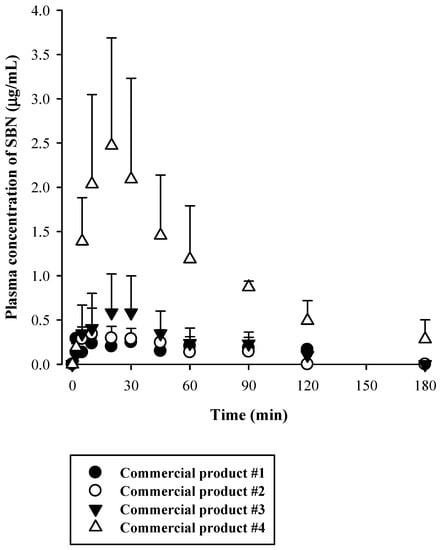 Rats were administered oral silymarin products at 200 mg/kg as SBN. Following this, plasma concentrations versus time profiles of SBN were assessed (Figure 3). Their relevant pharmacokinetic parameters are listed in Table 4. The oral SBN dose was selected based on previous preclinical pharmacokinetic studies on SBN [,,,]. We identified linear terminal phases of plasma concentration profiles obtained from oral studies. After the oral administration of the four silymarin products, plasma SBN levels reached respective peaks (Cmax) at 2–30 min, which was rather consistent with previously reported rat data (11 ± 1.8 min) []. As shown in Table 4, the Cmax, AUCinf, and AUClast of SBN after oral administration of commercial product #4 were significantly higher than those after administration of the other commercial silymarin products #1–3 as follows: the AUCinf after administration of product #4 was 6.3-, 8.3-, and 4.4-fold higher; the AUClast after administration of product #4 was 8.9-, 11.8-, and 6.2-fold higher; and the Cmax after administration of product #4 was 12.5-, 6.9-, and 4.2-fold higher than those after administration of products #1–3, respectively. These results clearly indicated that the commercial silymarin products exhibited fast oral absorption of SBN and that the bioavailability of SBN was higher with product #4 than with the other three products.