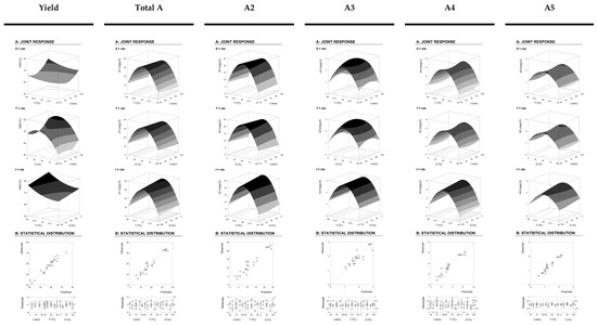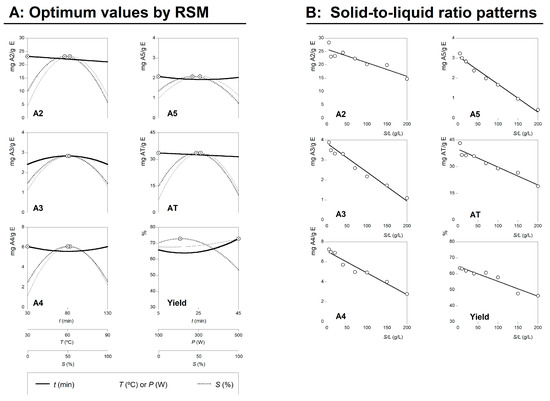The extraction results of HAE are a function of the combination of the three main variables involved (X1–3: t, T, and S) can be observed in Figure 1. In a more detailed form, part A of all figures in Figure 1 shows the 3D surface plots of the extraction obtained (Yield, %), the total anthocyanin content (AT, mg AT/g E), the major anthocyanin compound detected (A2, mg A2/g E), and the three minor anthocyanin compounds detected (A3 to A5, in mg/g E). These graphical illustrations are helpful to visualize the tendencies of each response and guide the selection of the most favorable conditions, while simultaneously considering all responses.
