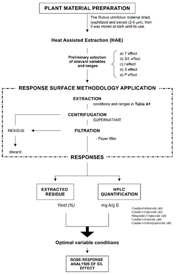 Heat assisted extraction (HAE) was performed according to a methodology previously described by Pinela et al. [9], using 1.0 g of the R. ulmifolius fruit with 20 mL of solvent with different conditions previously defined by the RSM design (Table 1): time (t or X1, 20 to 120 min), temperature (T or X2, 20 to 90 °C) and ethanol proportions acidified with citric acid (pH 2.5) (S or X3, 0 to 100%). The solid-to-liquid ratio (S/L or X4) was maintained at 50 g/L. After the extraction, the samples were centrifuged (6000 rpm for 20 min at 10 °C) and filtered (paper filter Whatman nº 4) and the supernatant was collected and divided into two portions for HPLC-DAD and extraction yield analysis. A portion of 3 mL was filtered through a LC filter disk (nylon filter 0.2 µm, 25 mm diameter, Whatman™, GE Healthcare, Buckinghamshire, UK) for chromatographic analysis and another portion of 5 mL was dried in an incubator (Jouan, Berlim, Alemanha) at 105 °C over 48 h for suspended solids determination in order to determine the extraction yield assessment.