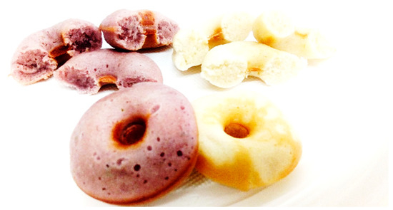 Donuts with an optimal extract rich in anthocyanin compounds (purple donut) and donut controls without the addition of extract (white donuts).