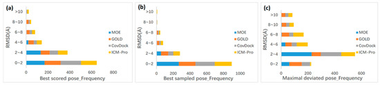 Stacked bar chart of docking performance over all 330 reference binding modes. The frequency of all RMSDs from the crystal ligand among best scored pose (a), best sampled pose (b), and maximal deviated pose (c).