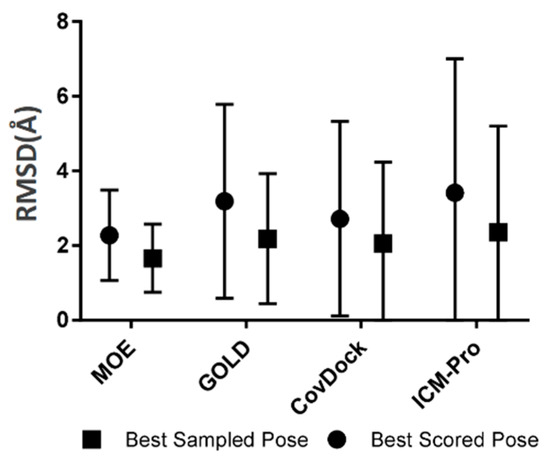 In this study, we utilized the docking programs MOE, GOLD, Schrodinger, and ICM-Pro for an evaluation of their ability to reproduce the co-crystallized covalent binding mode. In addition to GOLD’s implemented scoring functions (GoldScore), it has been optimized for the prediction of binding positions, which is consistent with our purpose; the other systems use a default scoring function.