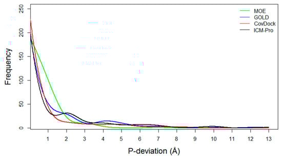 - P-deviation distributions. These distributions for all docking tools can be used to measure docking error ranges of the tools as shown in Figure 5 (the data are listed in Table S14). MOE (green) and CovDock (red) are closer to Gaussian distribution. GOLD (blue) and ICM-Pro (black) have two significant waves around 2Å and 4.5 Å suggesting that these tools have extraordinary errors around the 2Å and 4.5 Å ranges.