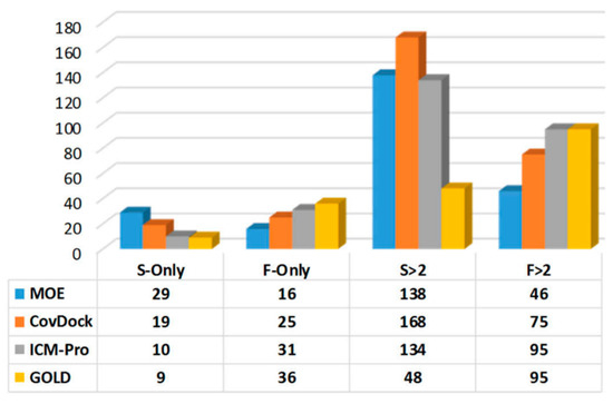 Combining the results in Figure 2 and Figure 3, we observed that MOE consistently produces superior docking results. However, if the generalities are based on warhead types, Schrödinger’s CovDock is superior to other docking tools.