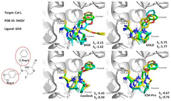 As shown in Figure 8, GOLD, CovDock, and ICM-Pro have significant deviations between Best Scored Pose and Best Sampled Pose measurements when docking GH4, the ligand of Cathepsin L, into the co-crystal structure (PDB code: 5MQY) [36]. They all produce correct binding poses using the Best Sampled Pose measurement but failed with the Best Scored Pose measurement. MOE, however, was able to generate correct poses with both measurements. Further analysis indicated that the failed poses were due to the two rings (rings A and B) at the tertiary of the fluoropyrimidine nitrile that exchange the sub-binding pockets. The corrected docking poses should be ring-A for S3, and ring-B for S2. Only MOE docked the rings into the correct sub-binding pockets with both measurements. Although the favorable interactions of the ring-B in the aromatic cleft of the S2 pocket were identified in the docking position, the pose was not selected as the highest scoring conformation due to the potential hydrophobic collapse. Earlier results in the Cambridge Structural Database (CSD) showed that the ring-B attached through the unsubstituted propyl linker accounted for 27% of the collapsed conformation in all the crystal structures with this motif. As the ligand needs to bind to hCatL in an extended conformation, an energy penalty is involved in disrupting the collapsed conformation.