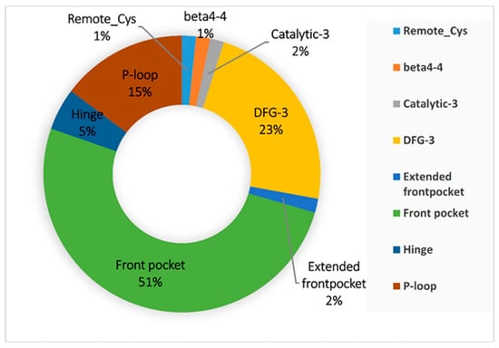 Cysteine is an anchor residue for kinases. This covalent anchor can be found in as many as eight domains: Remote-Cys, Beta4-4, Catalytic-3, Hinge, DFG-3, Extended front pocket, Front pocket, and P-loop. The possibility of the anchor residing at one particular domain, however, can vary. Based on our BCDE data set, the distribution of cysteine across kinase domains is depicted in Figure 9. The top three possible domains in which the anchor resides are Front pocket (31), DFG-3 (14), and P-loop (9). These domains offer greater possibilities for a cysteine to be used for covalent inhibitor design [37].