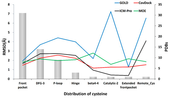 The front pocket is exposed to a polar environment suitable for the reaction and provides sufficient open space for the movement of the nucleophilic group. In contrast, the hinge region is not easily accessed by an electrophilic group of a ligand due to steric effects. The ligand has difficulty in accessing the thiol group of the cysteine, and it is hard for a covalent reaction to take place. Our results demonstrate that a docking tool can have better performance in the front pocket than in the hinge area (Figure 10). This observation is consistent with the work reported by Zhao et al. [38].
