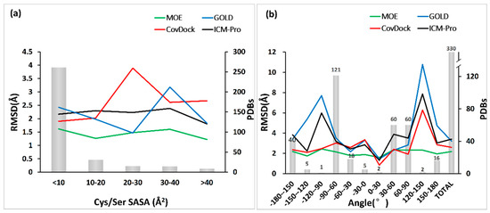 The flexibility of the domain hosting an anchor residue, in this case, cysteine or serine, affects the docking performance. The flexibility can be measured by the solvent accessible surface area (SASA) and the dihedral angle of N–CA–CB–SG/OG [39]. The relations of the docking accuracy (measured in Best Scored Pose) and SASA and the dihedral angle are depicted in Figure 11a,b.