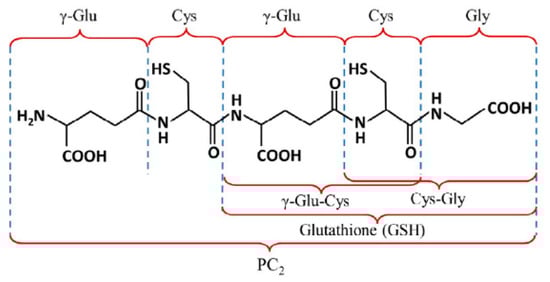 Currently, heavy metal pollution is a serious environmental problem that is affecting animals and plants. Fortunately, plants have developed protection mechanisms against heavy metals’ toxic effects. One of those mechanisms is the synthesis of cysteine-rich peptides (CRp) such as glutathione, glutathione oxide, metallothionein, and phytochelatin. Glutathione (GSH) and those other peptides contain the γ-glutamate-cysteine-glycine tripeptide, usually known as the Glu-Cys-Gly unit, which makes them effective in encapsulating heavy metals by means of the (-SH) cysteine group action. Since metal´s toxicity affects the cytoplasm during its passage across to the vacuole where they are stored, encapsulation prevents direct contact of the metals with the tissue, thus minimizing damage []. Cysteine-rich peptides extensions such as phytochelatin (Figure 1), contain between 2 and 11 repetitive units of γ-Glu-Cys ending on a Gly terminal or contain 2 or 3 unit chains of glutathione, which could act in the encapsulation process. Generation of CRp has been studied in a wide variety of plants and microorganisms. It has been shown that CRp could be taken as a response to heavy metal contamination and it is understood that the best trigger of cysteine-rich peptides generation is Cd, followed by Pb, Hg, and Zn [,].