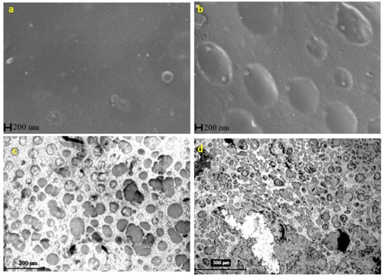 To study the morphology and structure of the bimetallic nanoparticles, SEM images were taken to the bare Cu electrode, to the Nafion-covered (Nf/Cu) electrode, and to the bimetallic modified (AgHgNf/Cu and AgBiNf/Cu) electrodes. Figure 2a shows a micrographic view of the naked Cu electrode. A very flat surface is observed as a result of the polishing process. Figure 2b represents the electrode surface already covered with Nf. Oval spots evenly scattered all around the Cu surface, whose appearance is not as flat as that of the bare Cu electrode, are due to the presence of the Nafion polymer film covering the electrode surface. Micrographs of the AgHgNf/Cu and AgBiNf/Cu surface are shown in Figure 2c,d, respectively. Bimetallic particles (white spots) with 150 nm approximate diameter are observed attached to the Nafion membrane. Since this is a backscattered electron image, the metallic particles are shinier than the Nafion film. The spreading of the shinier surface shows that the metallic nanoparticles are well distributed on the whole electrode surface [].