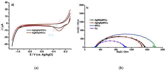 (a) Cyclic voltammetry (CV) responses of the AgHgNf/Cu and AgBiNf/Cu electrodes in a 0.1 mol L−1 ammonium chloride buffer solution, pH 9.5. Scan rate 0.01 V s−1. (b) Nyquist impedance of the Cu electrode (purple curve), Nf/Cu electrode (blue curve), AgHgNf/Cu electrode (red curve), and AgBiNf/Cu electrode (black curve) in a 0.1 mol L−1 ammonium chloride buffer solution, pH 9.5, at −1.1 V. The frequency range is from 0.1 Hz. to 100 kHz.