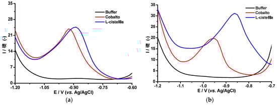 Differential pulse voltammetry responses of the Brdička supporting electrolyte in the absence and the presence of L-cysteine using the AgBiNf/Cu modified electrode is displayed in Figure 4a. A reduction peak at −0.93 V (red curve), attributable to Co, was also observed. After addition of the l-cysteine peptide, the Co reduction peak was shifted about 0.2 V towards less negative potentials (blue curve). This behavior could be associated with the formation of the Co–Cys complex and reduction of Co from the complex, which requires less energy than its reduction in the absence of the peptide []. Similar behavior was observed using the AgHgNf/Cu electrode (Figure 4b).