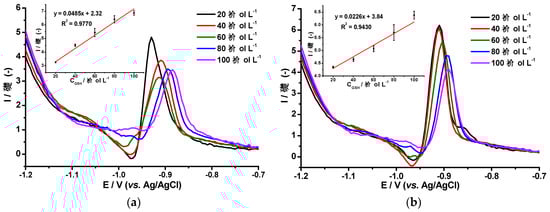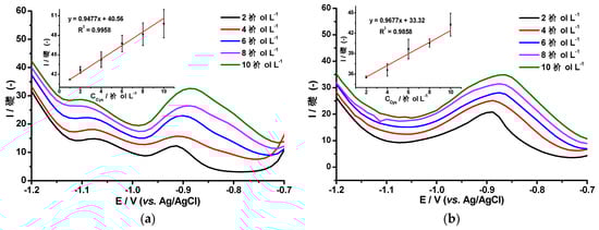 VPD responses of (a) AgHgNf/Cu electrode and (b) AgBiNf/Cu electrode in the Brdička supporting electrolyte after addition of 2 to 10 µmol L−1 of l-cysteine. Inset: Calibration curves of l-cysteine at the modified electrodes. 25 mV s−1 scan rate.