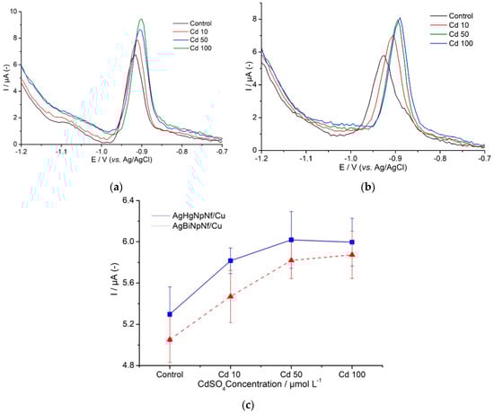 Differential pulse voltammetry signals obtained during the experiments: (a) AgHgNpNf/Cu electrode and (b) AgBiNpNf/Cu electrode. (c) Dependence of the HE current generated by nicotiana tabacum cells on increasing concentration of Cadmium sulfate in a Brdicka medium using the AgBiNf/Cu, and the AgHgNf/Cu electrodes in a Brdička medium, after 5 days culturing.