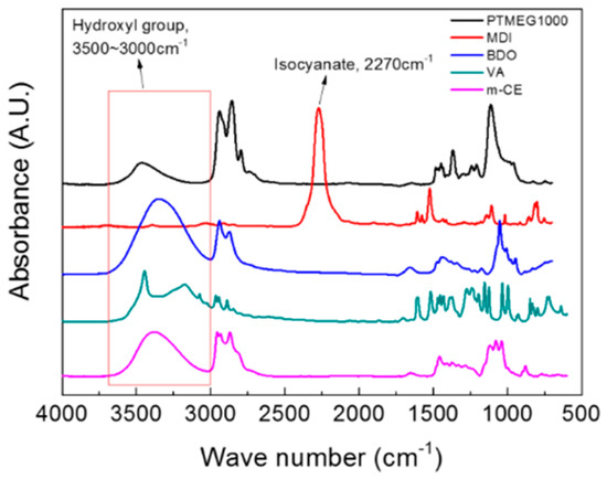 Fourier-transform infrared (FT-IR) spectra of the raw constituents of the synthesized polyurethane elastomer (PU). Note: PTMEG, poly(tetramethylene ether)glycol; MDI, 4,4’-methylene diphenyl diisocyanate; BDO, 1,4-butanediol; VA, vanillyl alcohol; and m-CE, modified chain extender.